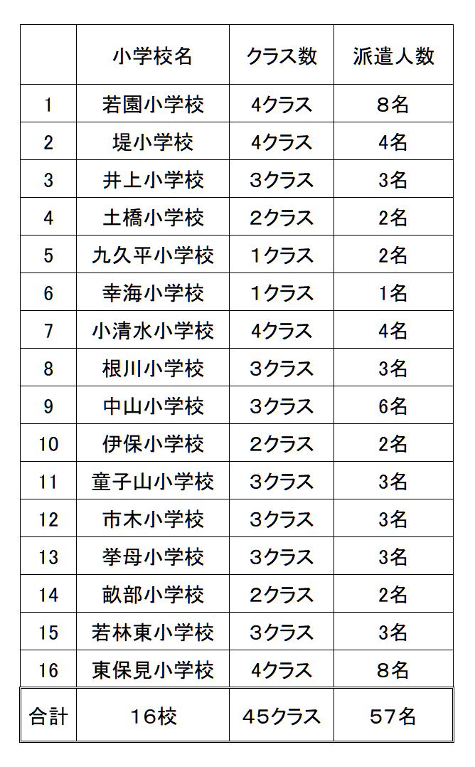 16校45クラスにおいて述べ57名の講師を派遣し、小学校珠算指導ボランティアを実施しました。